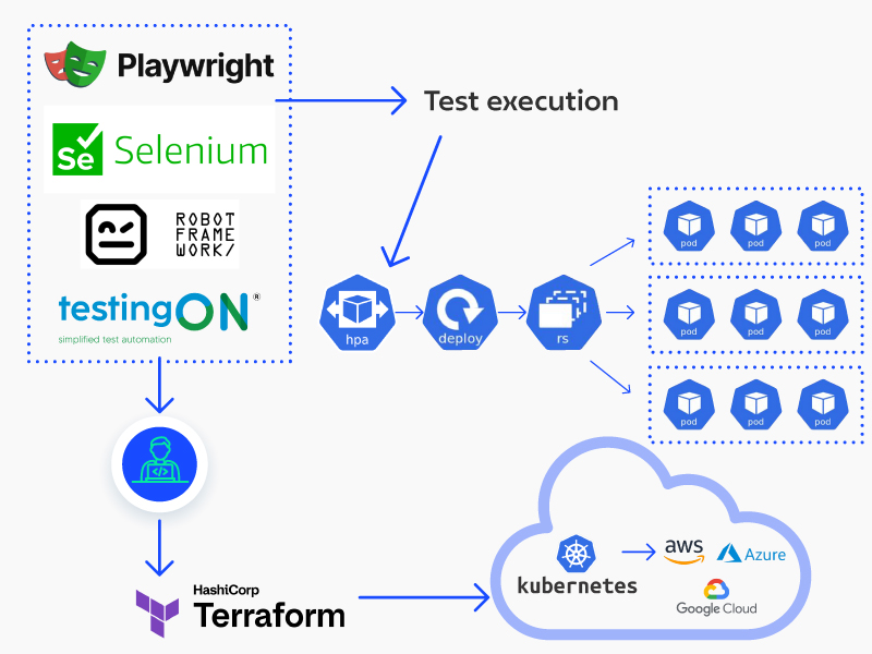 4. Cloud Execution Layer – to run tests where Runners & Workers orchestrated by Kubernetes + Infrastructure as Code (IaC) ensure seamless scaling across environments.