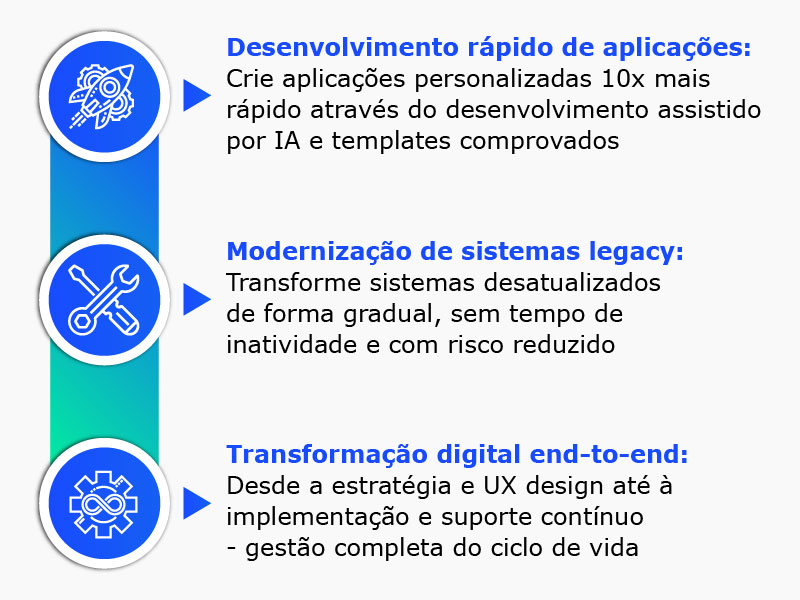 Experiência certificada em OutSystems para acelerar o desenvolvimento low-code, modernizar aplicações e integrar soluções com IA